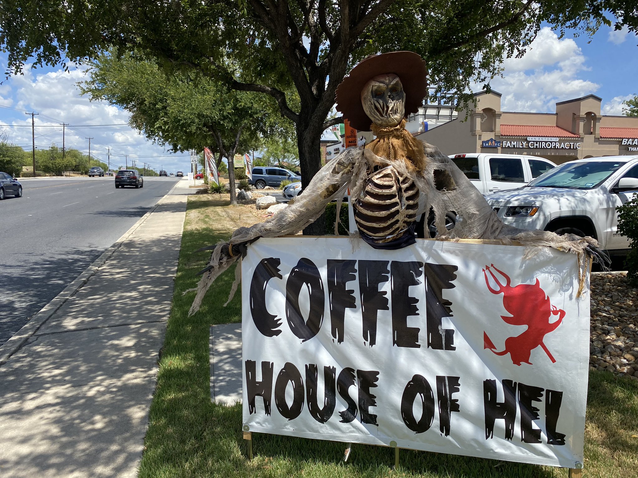 This shop is sure to scare the frappe out of anyone. Opening at 600 AM tomorrow. San Anto West Side Coffeehouse.